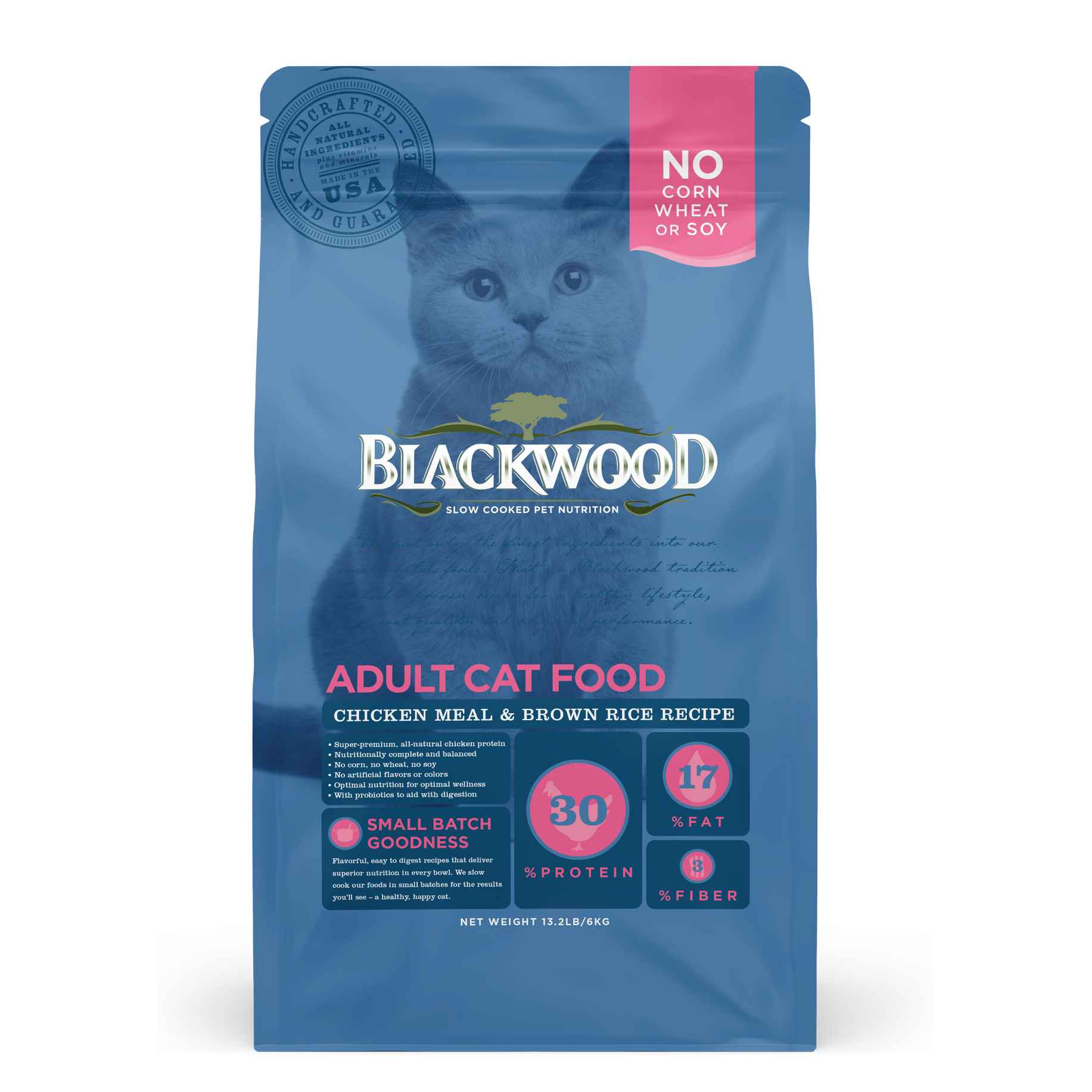 - Our slow cooked, grain free cat food is handcrafted with the natural goodness of chicken, Whitefish, cranberries and blueberries. Blackwood cat food never contains corn, wheat, or soy making it the perfect solution for food sensitivities