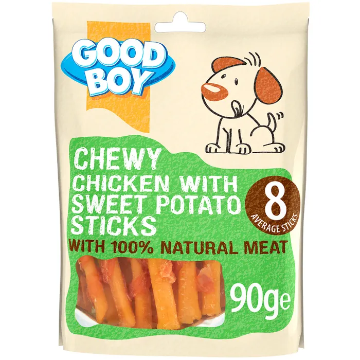 - I’m made with 100% natural chicken breast and am sure to get your dogs’ tail wagging. Super scrummy chicken is wrapped around my yummy sweet potato centre, creating the perfect treat for rewarding your pooch at home or whilst out and about.
