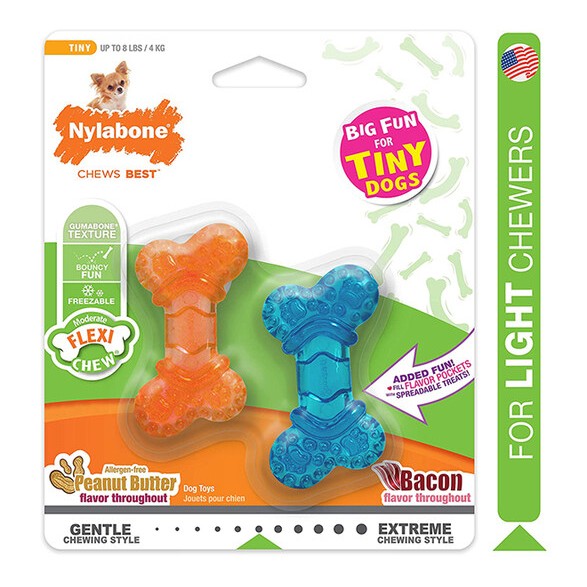 Our Moderate Chew Mini Bone chew toys are the perfect pastime for your tiny dog! Each chew toy is flavored throughout—one in yummy peanut butter and the other in savory bacon. Their textured bone shape also helps clean your dog’s teeth and reduce plaque and tartar buildup. Suitable for dogs up to 8 lbs.