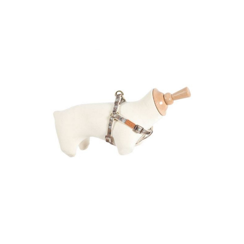 Blue adjustable taiga dog harness with decorative leaf print. Dog harness from the Taiga range with a soft pastel color and decorative leaf print . These harnesses are made of a breathable blend of Polyester and Cotton. They have a leather encroachment with an IMAO inscription and a copper metal buckle.